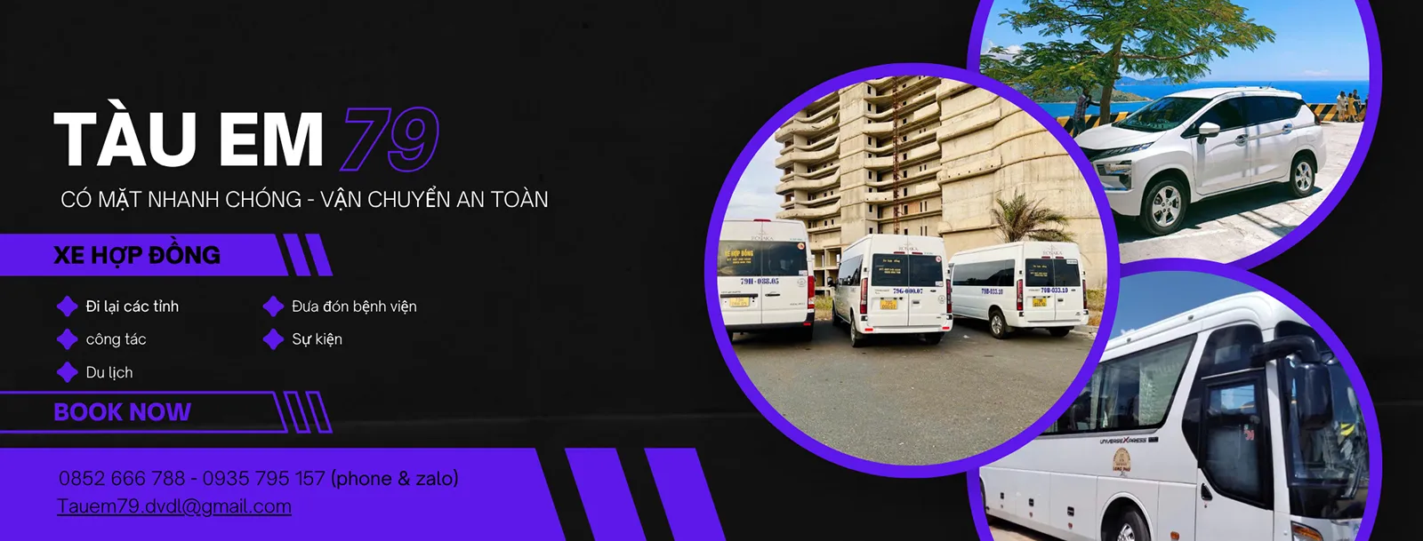 DVDL Tàu Em 79 - đơn vị cung cấp dịch vụ xe hợp đồng uy tín hàng đầu tại Nha Trang! Chúng tôi mang đến các loại xe đời mới (4, 7, 16, 29 chỗ), được bảo dưỡng định kỳ, đảm bảo an toàn và thoải mái cho mọi chuyến đi. Dịch vụ xe hợp đồng trọn gói lý tưởng cho du lịch, công tác, đưa đón, hay các hành trình từ Nha Trang đến Đà Lạt, Mũi Né, Vũng Tàu, Quy Nhơn... với giá cả minh bạch. Tài xế chuyên nghiệp, hỗ trợ 24/7. Gọi ngay 0852666788 hoặc 0935795157 để đặt xe nhanh chóng và trải nghiệm hành trình suôn sẻ!